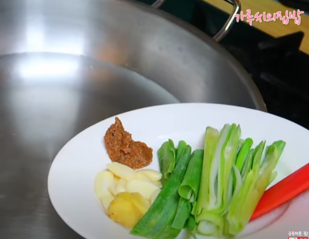 2. 물에 찌시는 것도 좋지만, 꽃게의 향을 높이고 비린내를 잡기 위해 대파 1/2대, 얇게 썬 통마늘 3알, 편생강 2조각, 된장 1/2T를 넣어줍니다. 이건 선택 사항이니 취향에 맞게 조절하세요.