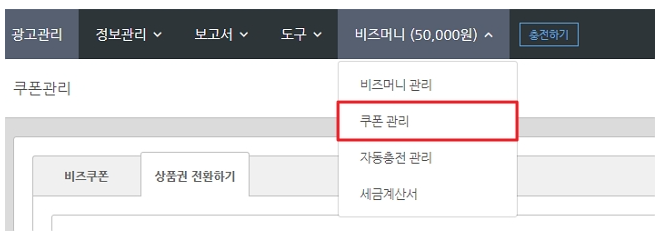 3. 광고시스템의 [비즈머니 > 쿠폰관리 ] 메뉴클릭
