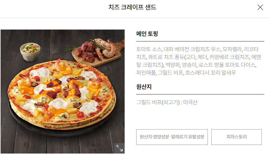 - 총 7가지 치즈와 스테이크, 슈림프 토핑을 얹은 피자