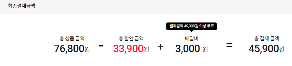 - 총 76,800원 에서 33,900원이 할인되었습니다. 매장마다 배달요금 무료기준을 확인하시면 배달비절약도 가능하십니다.