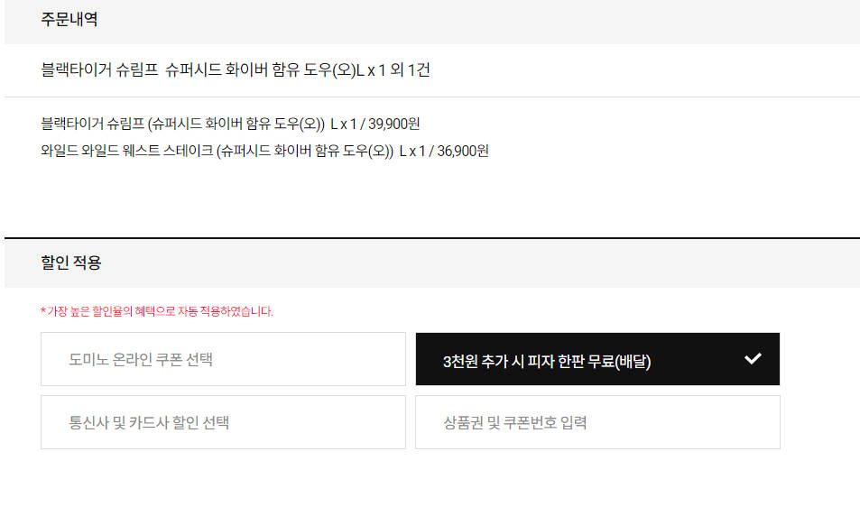 - 피자(l) + 사이드디시 + 음료 주문 시 혜택 적용 가능
