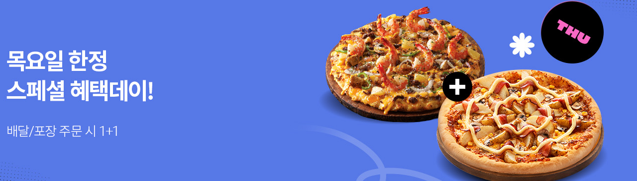 목요일만 혜택을 받으실 수 있는 이벤트입니다. 온라인과 오프라인 주문 모두 이용가능해요. 원하는 피자 2판을 장바구니에 담고 한판의 가격만 지불하시면 됩니다.