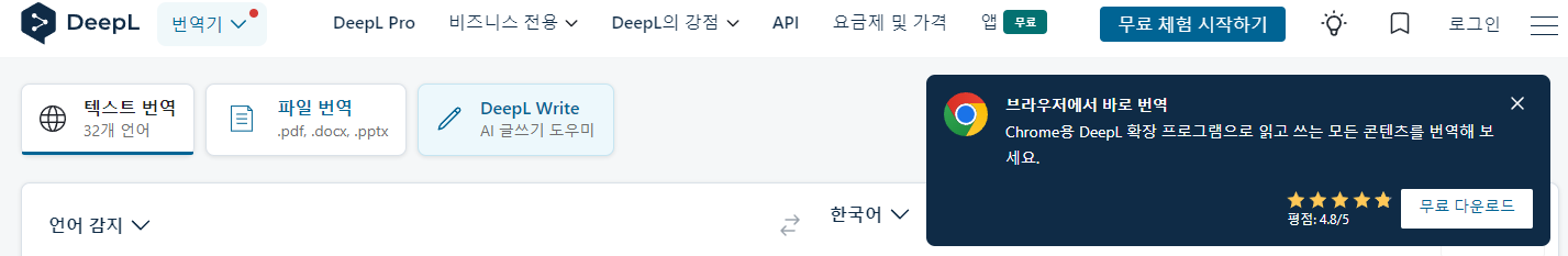 Chrome, Edge, Firefox 등의 브라우저에서 딥엘 확장 프로그램을 설치할 수 있습니다.